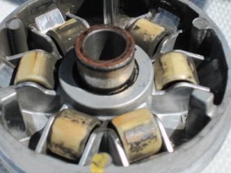 ウェイトローラーはドライブフェイスの裏側に収まっていますが、偏磨耗しています。ドライブベルトが磨耗する際に出る粉塵が入り込んでローラーが回転しにくくなることが原因だろうと思います。ローラーを収めていたハウジング側は粉塵で汚れてなく、ローラーも磨耗した部位には粉塵がついていません。